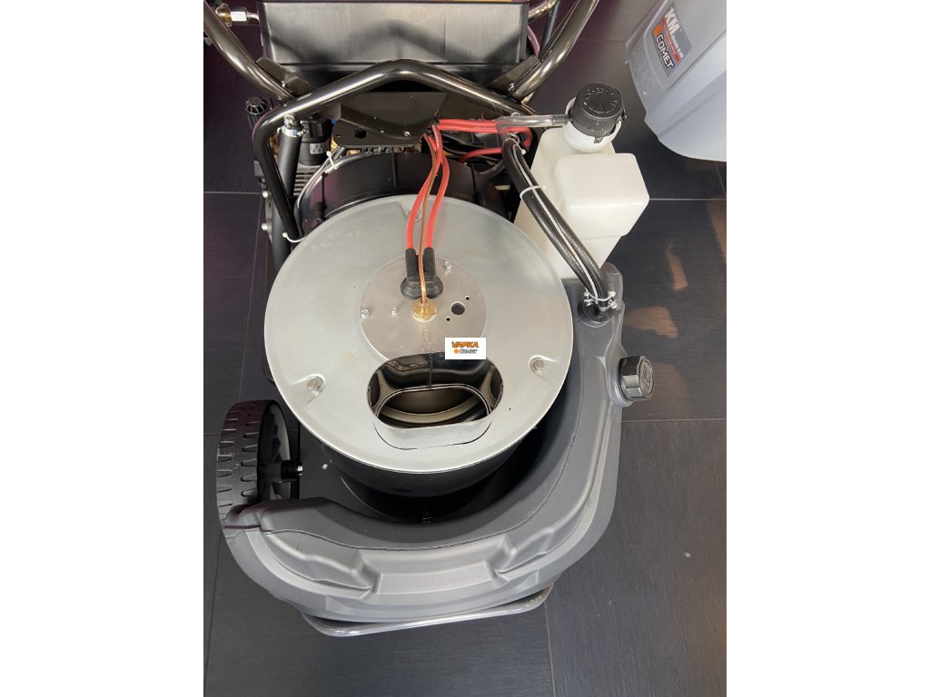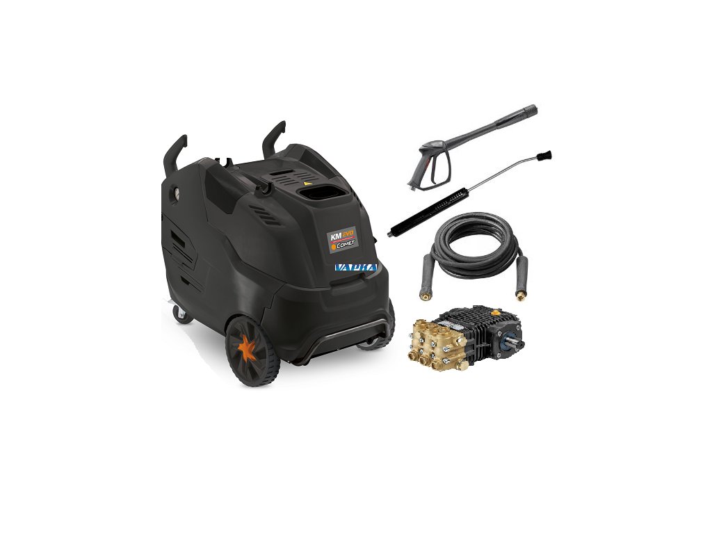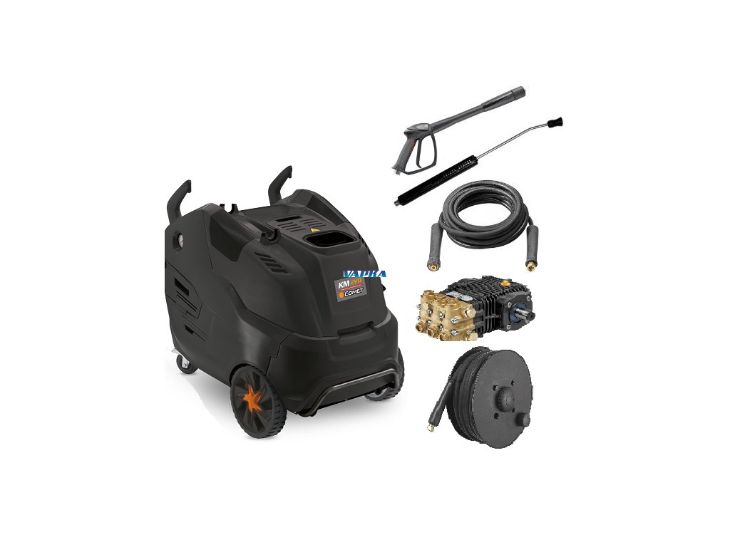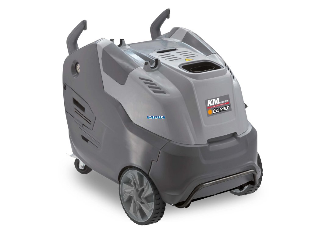 COMET KM CLASSIC 8.16 X ( s navijákem s 15m hadicí ) - 200 Bar vysokotlaký čistič s ohřevem vody 110 st.C Wapka je vybavená samostatným ventilátrem pro spalování v kotli. Dobrá manipulace díky bočním dvířkům k nastavení tlaku a kontrolu filtrů. V přední části nahoře je víko, kryjící nádobu na čistící prostředek. Snadný přístup k přepravnímu háku, vybavení kovovým předním nárazníkem, dvěma velkými pevnými koly a dvěma otočnými