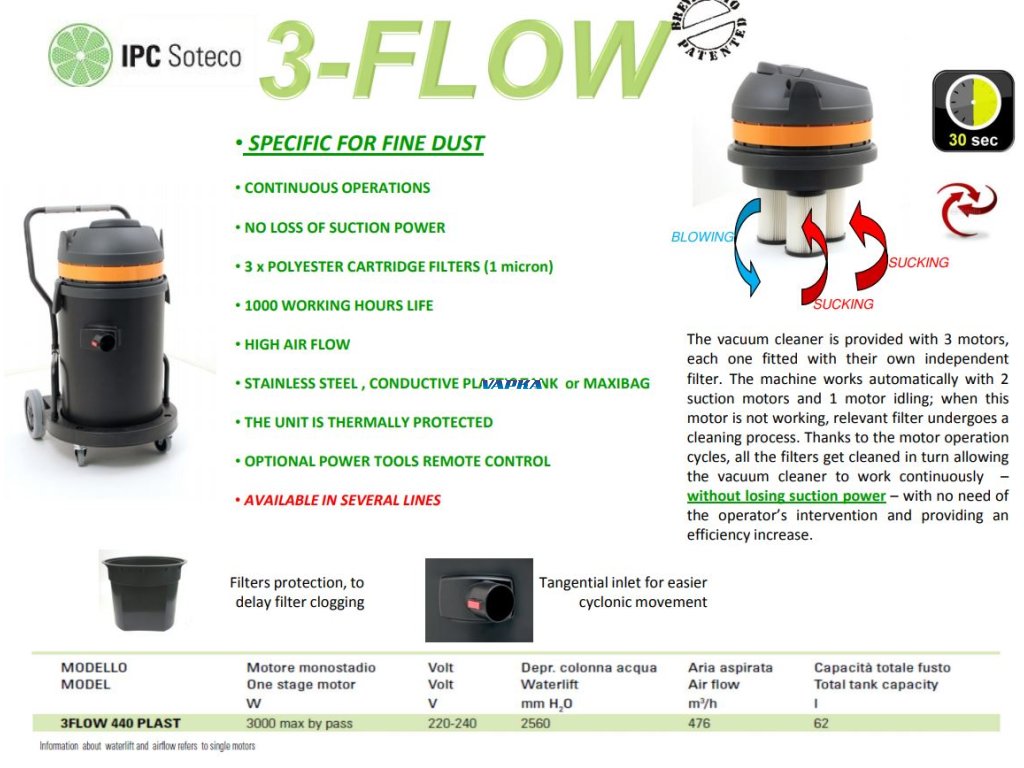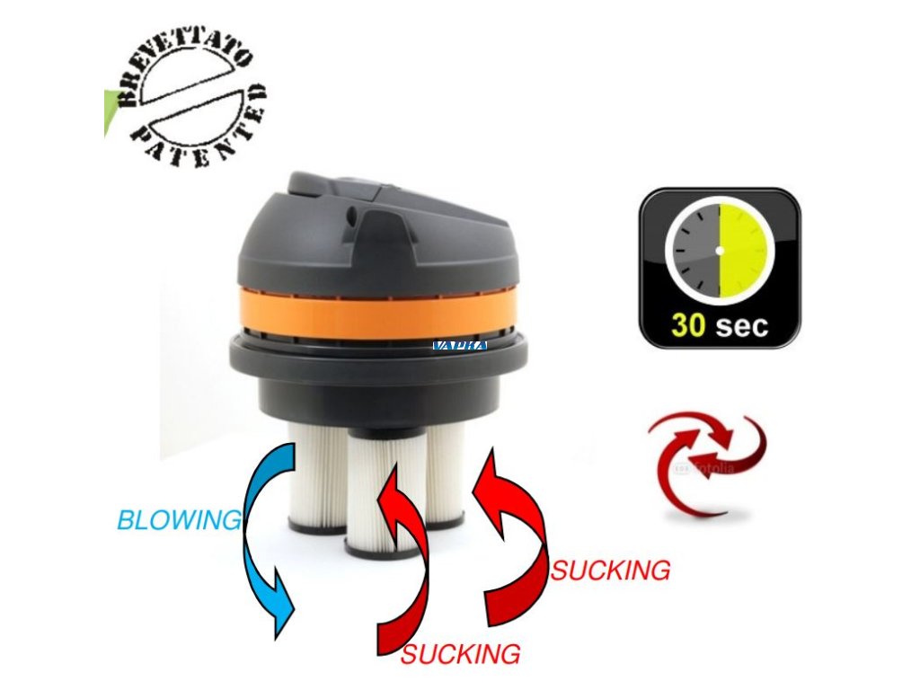 - Současně vždy pracují pouze 2 motory, zatímco třetí se čistí. Po 30 vteřinách se funkce motorů mění. Díky tomuto systému nedochází k úbytku sacího výkonu a efektivitě vysávání. Další výhodou je dlouhá životnost motorů, snadná manipulace. K dispozici je plastová i nerezová nádrž.