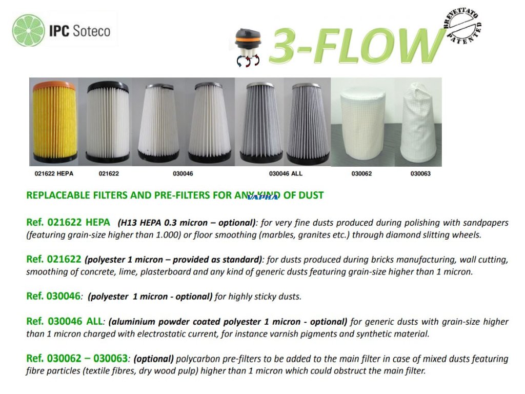 Profesionální vysavač GS 3/62 3FLOW je vybaven polo- automatickým oklepem filtrů, představuje nový patentovaný systém určený k odsávání jemných prachů.