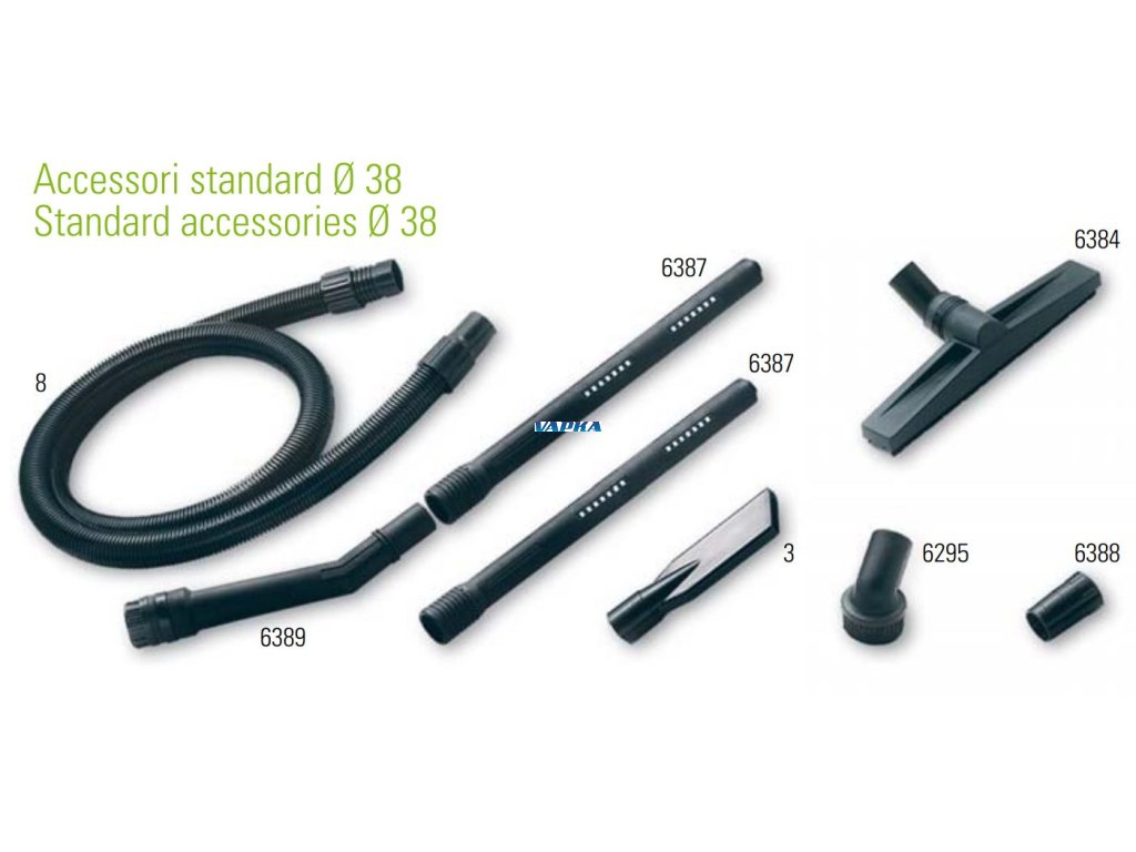 Součástí je příslušenství - příslušenství DN: 40 - Sací hadice s koncovkami, koncovky, Sací kovové S roury, Podlahová sací dýza na sucho, štěrbinová hubice, sací kartáček. koleno sací s regulací, adaptér.