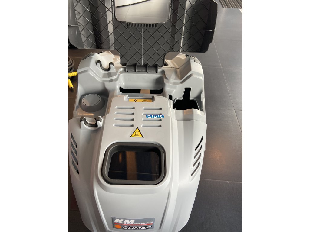 KM Classic 8.16 15/260 - Profesionální vysokotlaký čistič s ohřevem vody. Wapka je vybavená samostatným ventilátrem pro spalování v kotli. Dobrá manipulace díky bočním dvířkům k nastavení tlaku a kontrolu filtrů. V přední části nahoře je víko, kryjící nádobu na čistící prostředek. Snadný přístup k přepravnímu háku, vybavení kovovým předním nárazníkem, dvěma velkými pevnými koly a dvěma otočnými