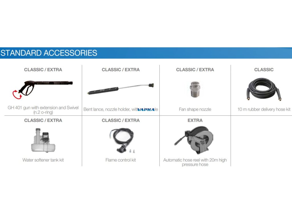 Vybavený čerpadlem s klikovou hřídelí ZW-250 Comet . 4-pólový elektromotor (1450 ot./min) s tepelnou ochranou a chlazením vzduchem. Tři keramické písty, mosazná hlava, čerpadla ZW/FW2. Je vybaven • Externí obtokovým ventilem, • SS ventily na sání a výtlaku, • Nasávání čisticího prostředku pod vysokým tlakem (z nádrže, externí u modelů Extra) s elektromagnetickým ventilem, • Nádrž na naftu 25 litrů s ukazatelem úrovňe a filtr, • Vertikální hořák s vysokou ocelovou spirálou s silnou tepelná účinností, • Ovládací panel s ochranným krytem, • Všeobecné zastavení stroje (když se stroj nepoužívá po delší čas), • Zařízení proti vodnímu kameni s čerpadlem i nádrž na (2,5 L), • Detektor mikro-úniků, • Držák příslušenství, • Snímač průtoku hořáku a snímač plamene,